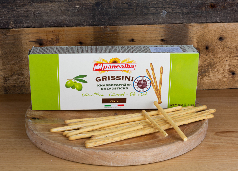 Grissini s olivovým olejom 125g. Vyskúšajte grissini s výberovým olivovým olejom. Rodinná firma každý deň vyberá z rúry širokú škálu chlebových tyčiniek, dobroty, ktoré pochádzajú zo starostlivého hľadania zdravých, pravých surovín, ktoré rešpektujú typickú tradíciu piemontských remeselníkov.